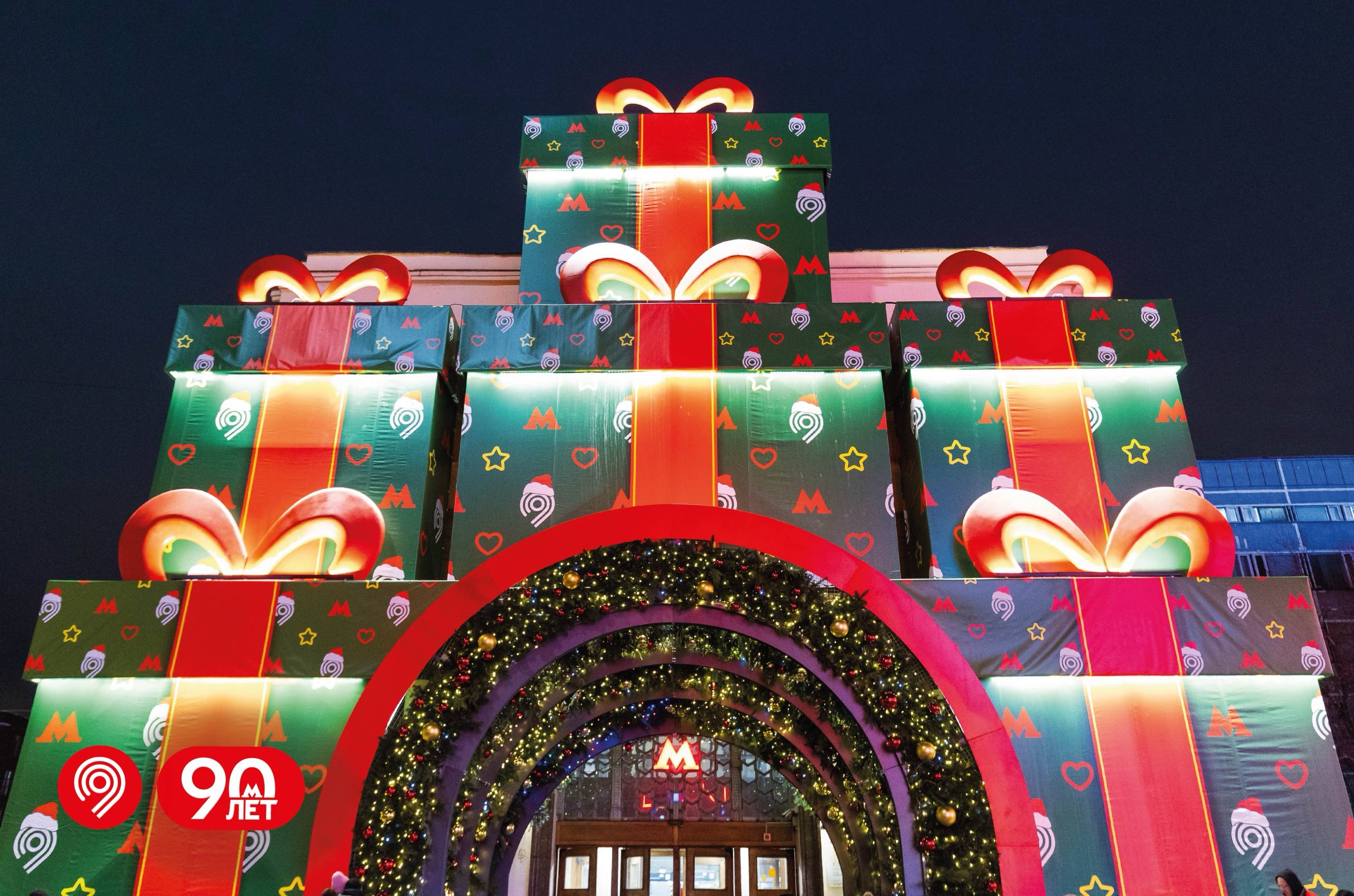 — станция «Семёновская». Фасад оформили инсталляцией в виде больших подарков;