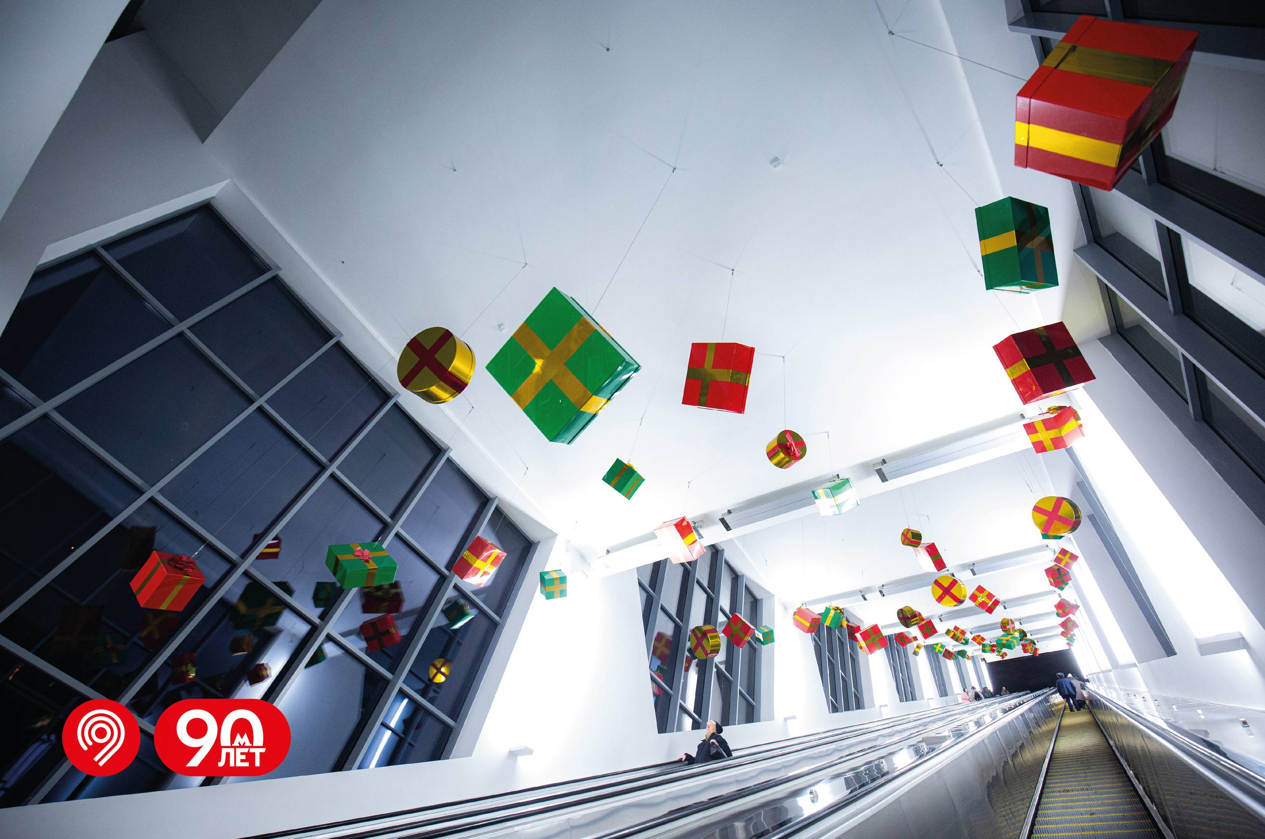 — эскалаторная галерея на Воробьёвых горах. Под потолком разместили 100 подвесных элементов в виде новогодних подарков.