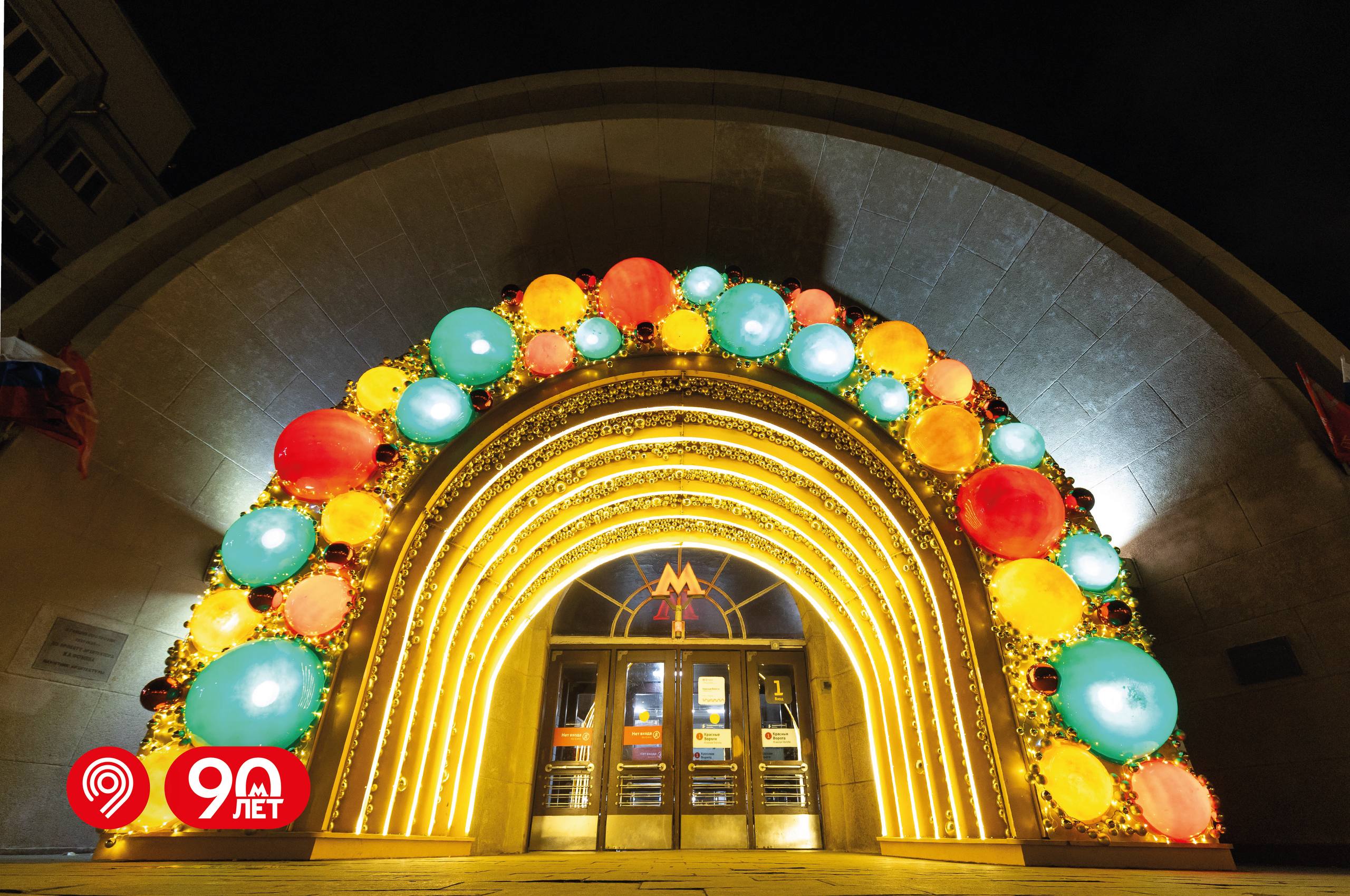 — станция «Красные ворота». У входа установили объёмную арку с разноцветной подсветкой;